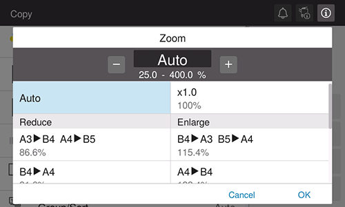 Fixed Zoom | Select a preset zoom ratio when copying a standard-size original onto standard-size paper. The paper tray is automatically exchanged depending on the selected zoom ratio. |