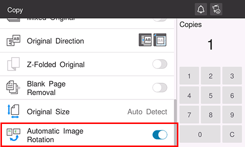 In general use, this machine automatically rotates the original image according to the paper direction to make a copy. Turning [Automatic Image Rotation] OFF as needed enables you to make a copy without rotating the original image. This function is available when you want to copy only a part of the original.