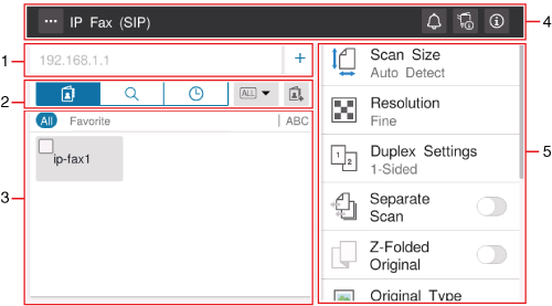 If you tap [IP Fax (SIP)] on the home screen, the main screen of IP fax (SIP) is displayed.