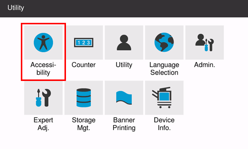 In [Accessibility] of [Utility], you can specify accessibility options of the operating environment such as the adjustment of the Touch Panel or a change of the keying sounds.