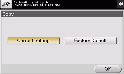 Change the default settings (when the power is turned on, or the Reset key is operated) in Enlarge Display mode. You can change the default setting by selecting [Current Setting] after the setting of each function is changed (default: [Factory Default]).