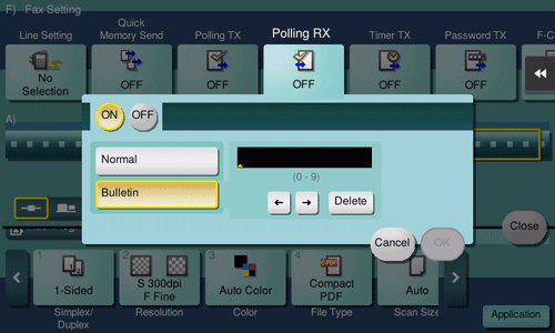 [Bulletin] | Select this option to receive a file stored in a Bulletin Board User Box. Enter the User Box number of the Bulletin Board User Box in the destination machine in which your desired file is stored. |
