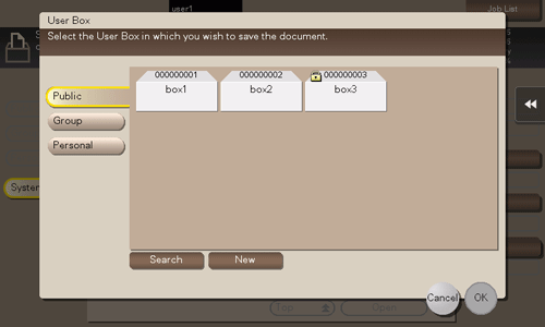 You can select a file and copy it to another User Box. The destination can be selected from the Public User Box, Personal User Box, and Group User Box.