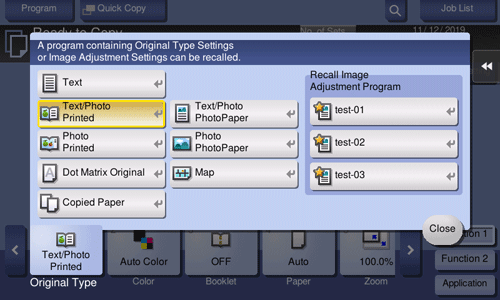[Recall Image Adjustment Program] | Call the image quality adjustment program. The registered content of a program is applied. For the image adjustment program, you can register the settings of [Original Type], [Density], [Bkgd. Removal], [Text Enhancement], [Neg-/Pos. Reverse], [Background Color], [Color Adjust], and [Mirror Image]. For details on the registration procedure, refer to Here. |
