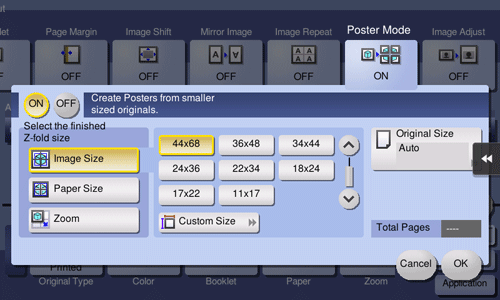 • [Paper Size]: Specify the finished size, which includes both the size after the image is enlarged and the overlap margin, in paper size. When you join the copied sheets at overlap margins, the finished size is smaller than the specified paper size.