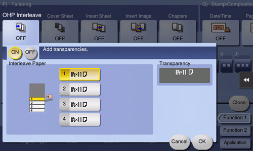 [Interleave Paper] | Select the paper tray for the paper to be inserted between transparencies. The paper size of the transparencies loaded on the Bypass Tray is displayed in [Transparency]. Be sure to use the same size for loaded transparencies and the paper to be inserted. |