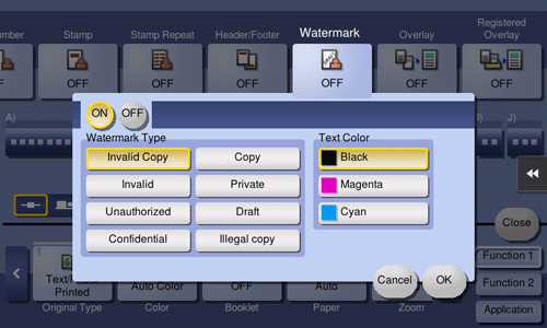 Part of the watermark may be lost depending on the paper size, such as A6 and B6. In this case, the machine automatically cancels the watermark function for copying.