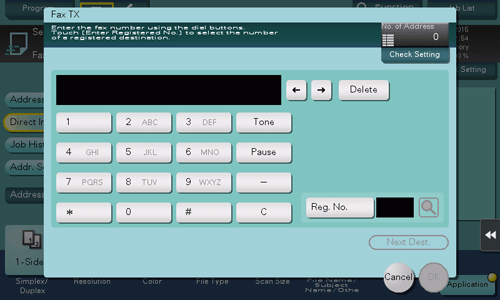 Enter the fax number of the destination. Tapping [Reg. No.] allows you to specify a fax destination by a registered number.