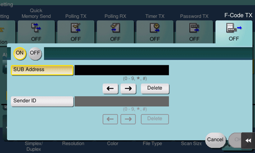 Tap [Application] - [Fax Setting] - [F-Code TX], and tap [ON].