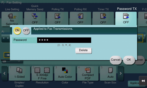 Tap [Application] - [Fax Setting] - [Password TX], and tap [ON].