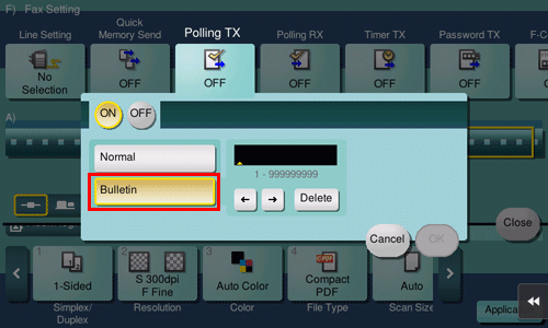 Tap [Bulletin], enter the number of the Bulletin Board User Box to register a file in, and tap [OK].
