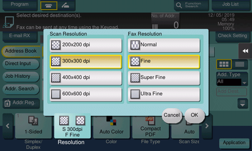 The finer the scan resolution is, the larger the data volume becomes, resulting in longer transmission time. To use an E-mail as a transmission method such as Scan to E-mail or Internet fax transmission, check that the data capacity are not limited.