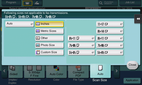 [Inches] | Select this option to scan an inch-size original. Tap [Inches], and also select a standard inch size. |