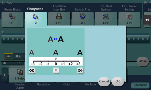 Specifying [Sharpness] sharpen the edges of images such as text in the table and graphics to improve legibility. This function also smoothens the rough contours of an image or sharpens blurred images.