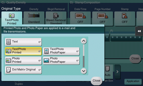 [Text/Photo Printed] | Scans an original consisting primarily of text and photos at the optimum image quality level. This function sharpens the edges of each character and reproduces smoother photos. Select this option to scan printed originals such as brochures and catalogs. |
