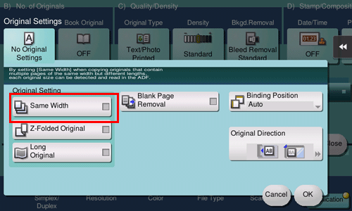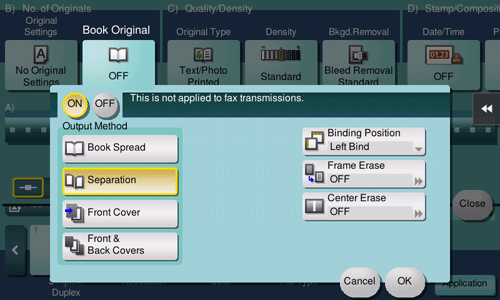 [ON]/[OFF] | Select [ON] to specify Book Original. |
