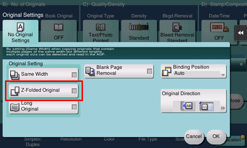 If a folded original is loaded into the ADF, the original size may not be able be detected accurately. When [Z-Folded Original] is specified, the original size can be accurately detected even for the folded original sheets.