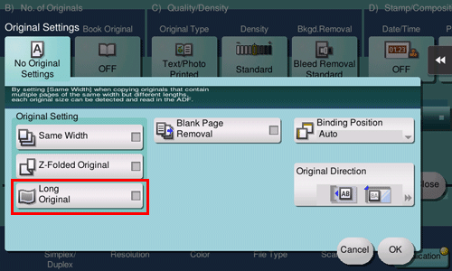 Load a long original that cannot be placed on the Original Glass and that is larger in the feeding direction than the full standard size (11 17 or A3) into the ADF. When [Long Original] is selected, the ADF automatically detects the size even if you do not pre-specify the original size.