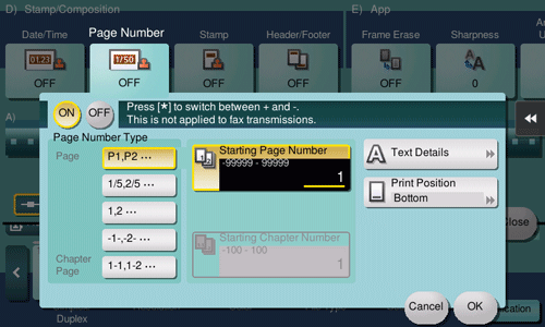 [Starting Chapter Number] | Specify the starting chapter number if a file is divided into chapters, and you want to print chapter numbers from the second chapter. You can specify starting chapter numbers when you have selected [Chapter Page] in [Page Number Type]. For example, to print chapter numbers from the third chapter, enter "-1". The first chapter of the file is counted as "-1", the second chapter as "0", and the third chapter is counted as "1". In [Starting Chapter Number], a chapter number is printed on the chapters that are count as 1 and later. If "2" is entered, a number is printed from the first page of the first chapter of the file as "2-1, 2-2". "-" (minus sign) switches "+" and "-" each time you tap [*]. |