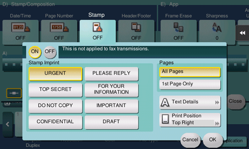 A text such as "PLEASE REPLY" or "DO NOT COPY" is printed on the first page or all pages. You can select the text to be added from the registered fix stamps and arbitrary registered stamps.