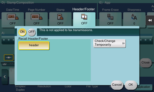 [Check/Change Temporarily] | If necessary, check or temporarily change the details of the program that is selected in [Recall Header/Footer].