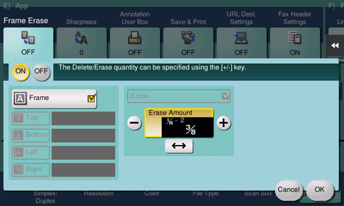 [Top]/[Bottom]/[Left]/[Right] | Specify a different width for each side of the original to erase the side. Cancel the [Frame] setting, select the side to erase the frame, and specify the width to erase in [Erase Amount]. If you do not want to erase the side, cancel the setting for [Erase]. |