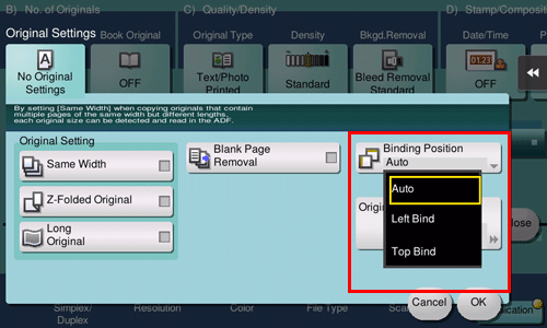 [Auto] | Automatically configures the binding position of the original. When the long side of the original is 11-11/16 inches (297 mm) or less, the binding position is set to the long side of the paper. When the long side of the original exceeds 11-11/16 inches (297 mm), the binding position is set to the short side of the paper. |