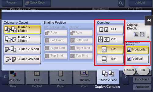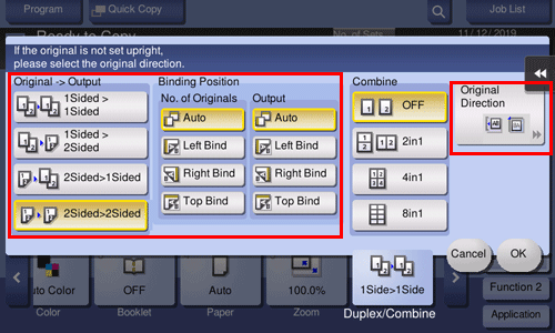 [Original > Output] | Select a combination of the original to be loaded (1-sided original or 2-sided original) and the copy method (1-sided copy or 2-sided copy). If you have selected other than [1Sided > 1Sided], also specify [Binding Position] and [Original Direction]. | |