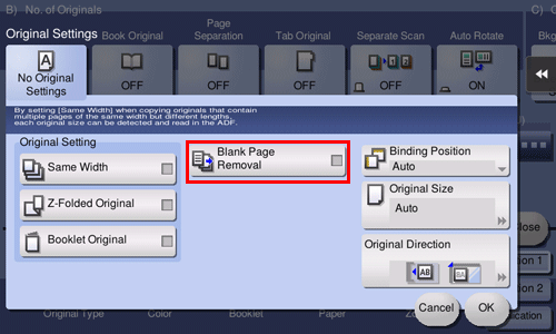 When [Blank Page Removal] is specified to scan an original including blank pages using the ADF, blank pages are excluded from scan targets. Blank pages detected are not counted as original pages.