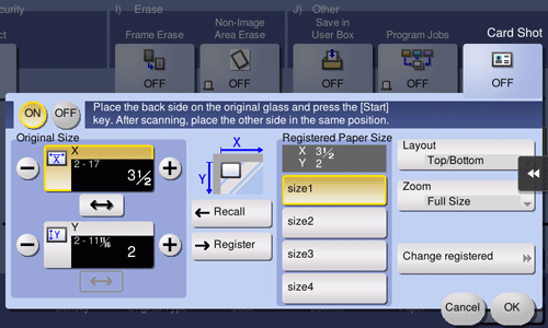 [Original Size] | Specify the size of a card to be copied. From the [Registered Paper Size], you can recall a size previously stored and specify the size. After you have entered the size, select a key in [Registered Paper Size], and tap [Register]. Then the size you have entered is registered in the memory. You can recall the registered size at a later date. |