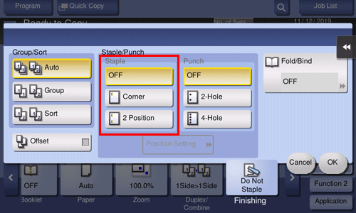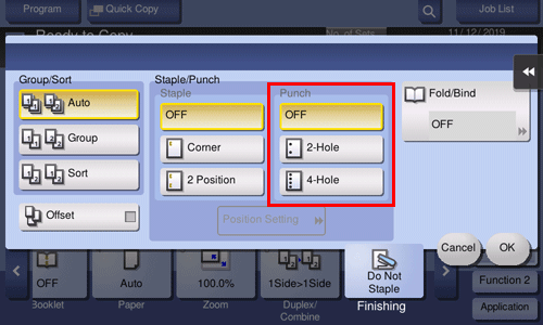 [Position Setting] | Select the punch position and original loading direction. If [Auto] is specified for the punch position, the punch position is determined automatically based on the direction of the loaded original. |