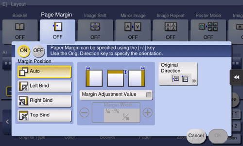 [ON]/[OFF] | Select [ON] to specify Binding Margin. |