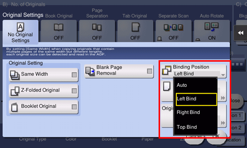 [Auto] | Automatically configures the binding position of the original. When the long side of the original is 11-11/16 inches (297 mm) or less, the binding position is set to the long side of the paper. When the long side of the original exceeds 11-11/16 inches (297 mm), the binding position is set to the short side of the paper. |