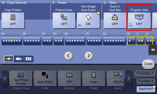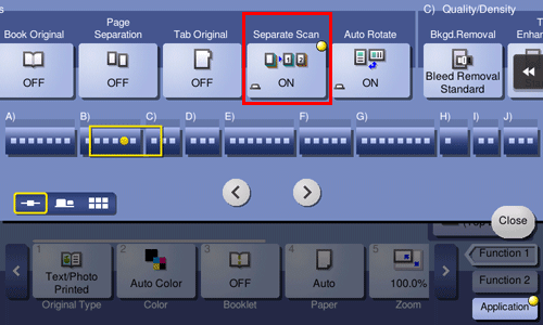 Scans each loaded original with different settings, and makes copies collectively. Use this function when various types of originals are mixed, such as 1-sided original to be printed on one side of paper, and 2-sided original to be copied by enlarging.