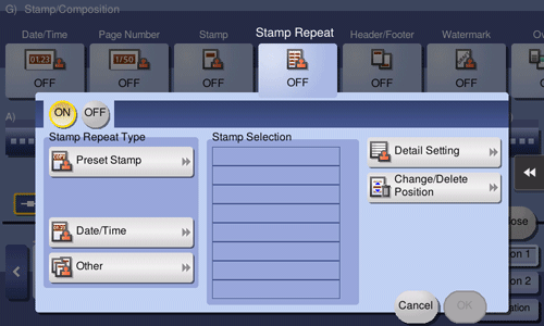 [ON]/[OFF] | Select [ON] to set Stamp Repeat. |