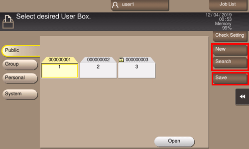 You can tap [New] to create a new User Box. For details, refer to Here.