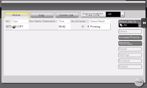 The icon and operation status of the active job are displayed while the job is running. For details on the icon types, refer to Here.