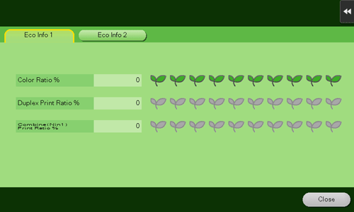 The Eco Info function automatically calculates the ratio of color print jobs to all print jobs, the ratio of paper saving by two-sided printing or page combine function, and a transition of power consumption based on the usage of this machine, all of which enables you to check the resulting eco information. You can review the operation method of this machine based on eco information to develop an awareness of costs and work to reduce costs.