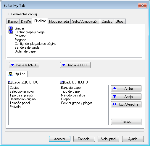Al hacer clic en [hacia la IZQU.], la función seleccionada se coloca en el área de la izquierda de [My Tab] y al hacer clic en [hacia la DER.], se coloca en el área de la derecha de [My Tab].