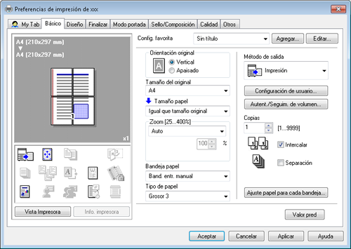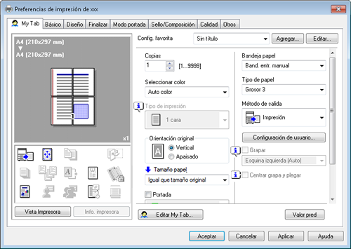En la ventana [Preferencias de impresión], puede definir las condiciones de impresión que desee registrar como favoritas.