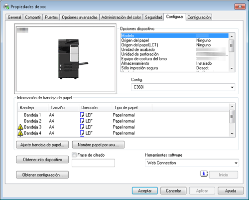 Si la comunicación OpenAPI es cifrada SSL y es posible obtener información sobre dispositivo de forma automática desde el controlador de impresora, la frase de cifrado puede obtenerse desde esta máquina. Para obtener más información sobre cómo cifrar la comunicación OpenAPI con SSL, consulte Aquí.