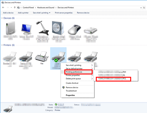 Haga clic con el botón derecho del ratón en el icono de la impresora instalada y, en [Preferencias de impresión], haga clic en el nombre de impresora que se muestra.