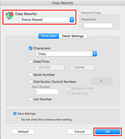 En [Stamp / Composition], seleccione la casilla de verificación [Copy Security] y, a continuación, haga clic en [Settings...]