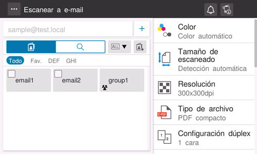 Al tocar la pestaña de búsqueda () se muestra la pantalla de búsqueda de destino. Si se utiliza el servidor LDAP o el Active Directory de Windows Server para administrar los usuarios, es posible buscar (Búsqueda de LDAP) por información de destino registrada en el servidor y especificar el destino deseado.