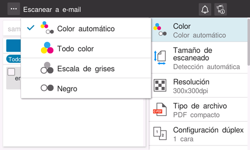 [Todo color] | Escanea a todo color, independientemente de si el original escaneado está en color o en blanco y negro. Seleccione esta opción para escanear originales que no sean en blanco y negro y escanear fotos en color. |