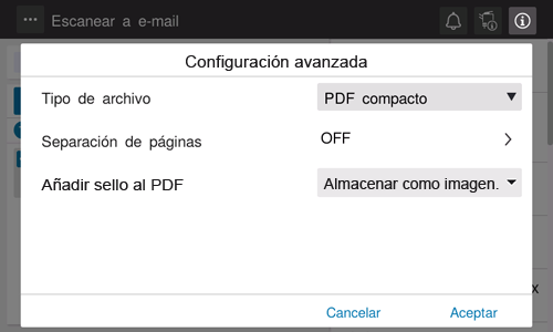 [Separación de páginas] | Si desea separar cada página en un archivo cuando el original tiene varias páginas, asigne a [Separación de páginas] el valor ON. Esta opción no está disponible cuando [Tipo de archivo] tiene el valor [JPEG]. Se separan todas las páginas.