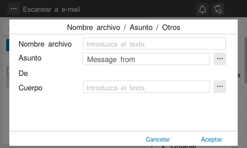 Cambie el nombre de archivo del original escaneado. Cuando envíe por correo electrónico, puede especificar el asunto y el texto del mensaje de correo electrónico y cambiar la dirección de correo electrónico del remitente (dirección "De").