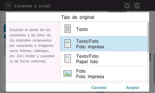 [Foto - Foto impresa] | Permite escanear un original que conste únicamente de fotos con un nivel de calidad de imagen óptimo. Seleccione esta opción para escanear originales impresos como, por ejemplo, folletos y catálogos. |