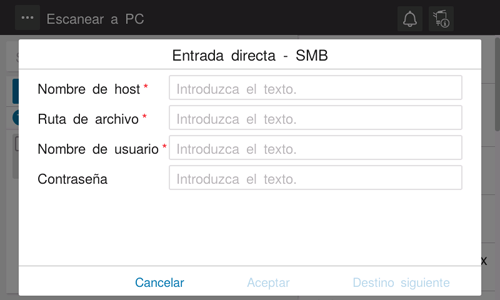 [Ruta de archivo] | Introduzca el nombre de la carpeta compartida del host especificado en [Nombre de host] (utilizando un máximo de 255 bytes).