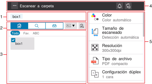 Si toca [Escanear a carpeta] en la pantalla de inicio, se abre la pantalla básica de Guardar en carpeta de usuario.